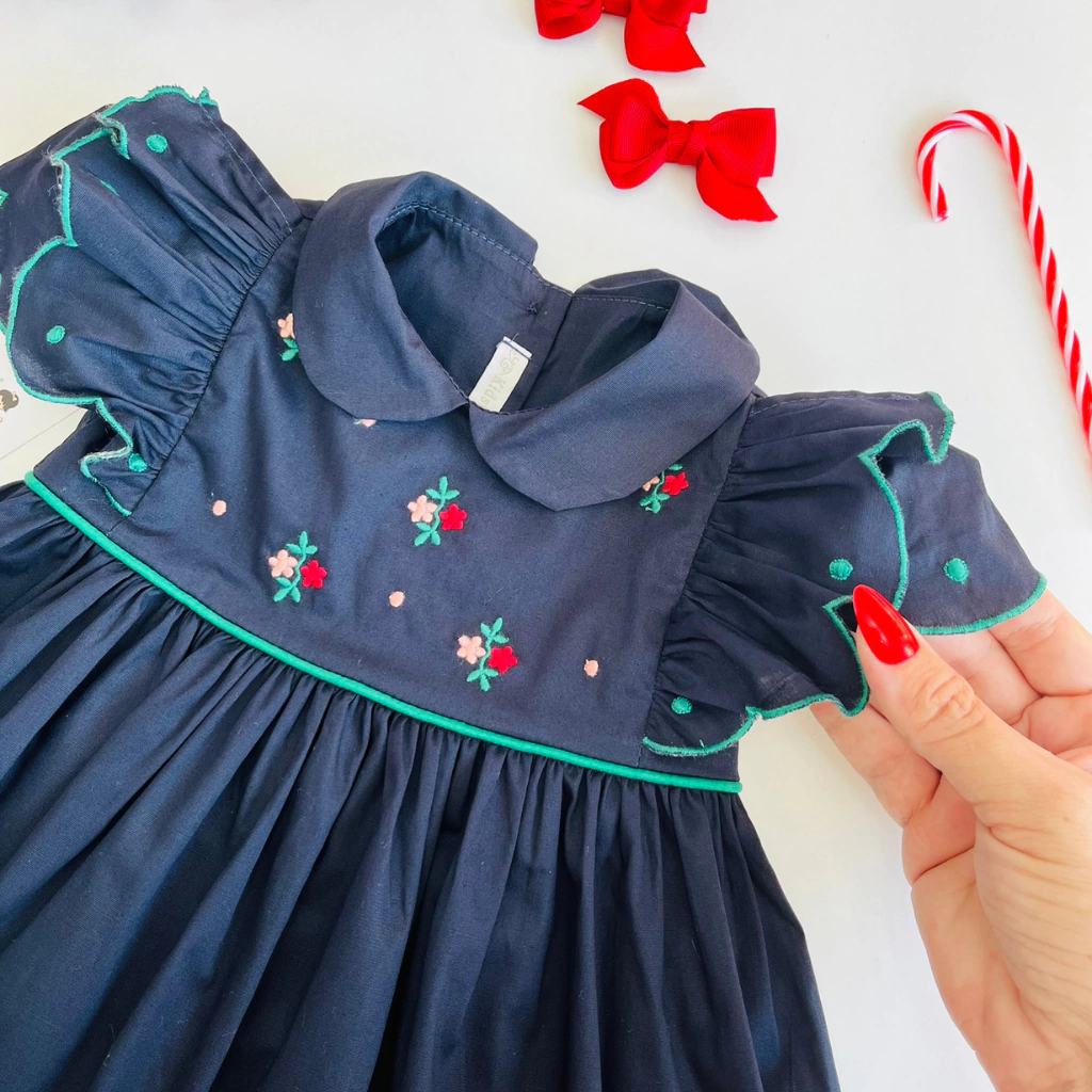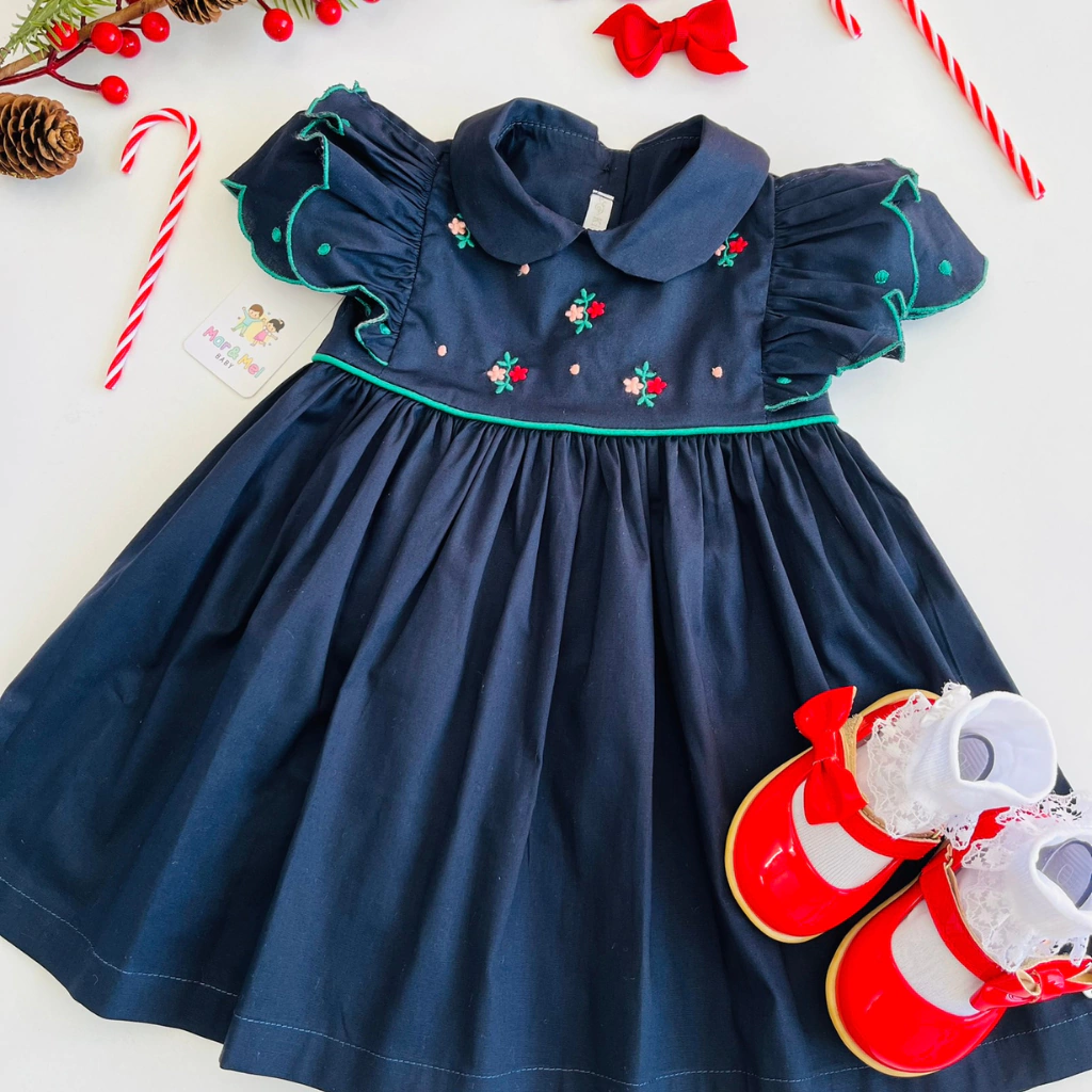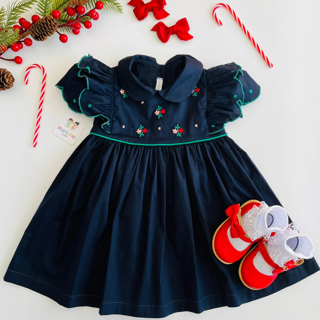 As manguinhas bufantes com babadinhos e acabamento verde deixam o visual ainda mais delicado e festivo, enquanto a gola boneca finaliza com um charme clássico e atemporal.
